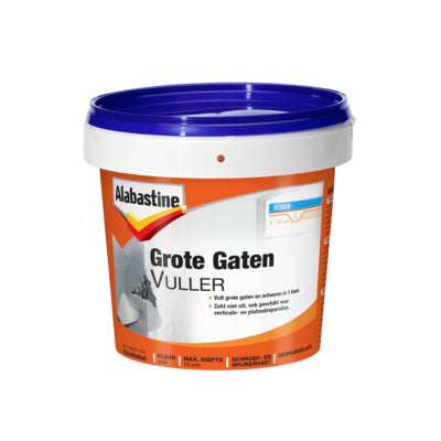 Als je grote gaten in onder andere steen en beton wilt vullen, is Alabastine kant-en-klaar grote gatenvuller het ideale product voor jou. Deze grote gatenvuller zakt niet uit, is voor binnen en buiten geschikt en is bovendien schuur-, spijker- en schroefbaar.