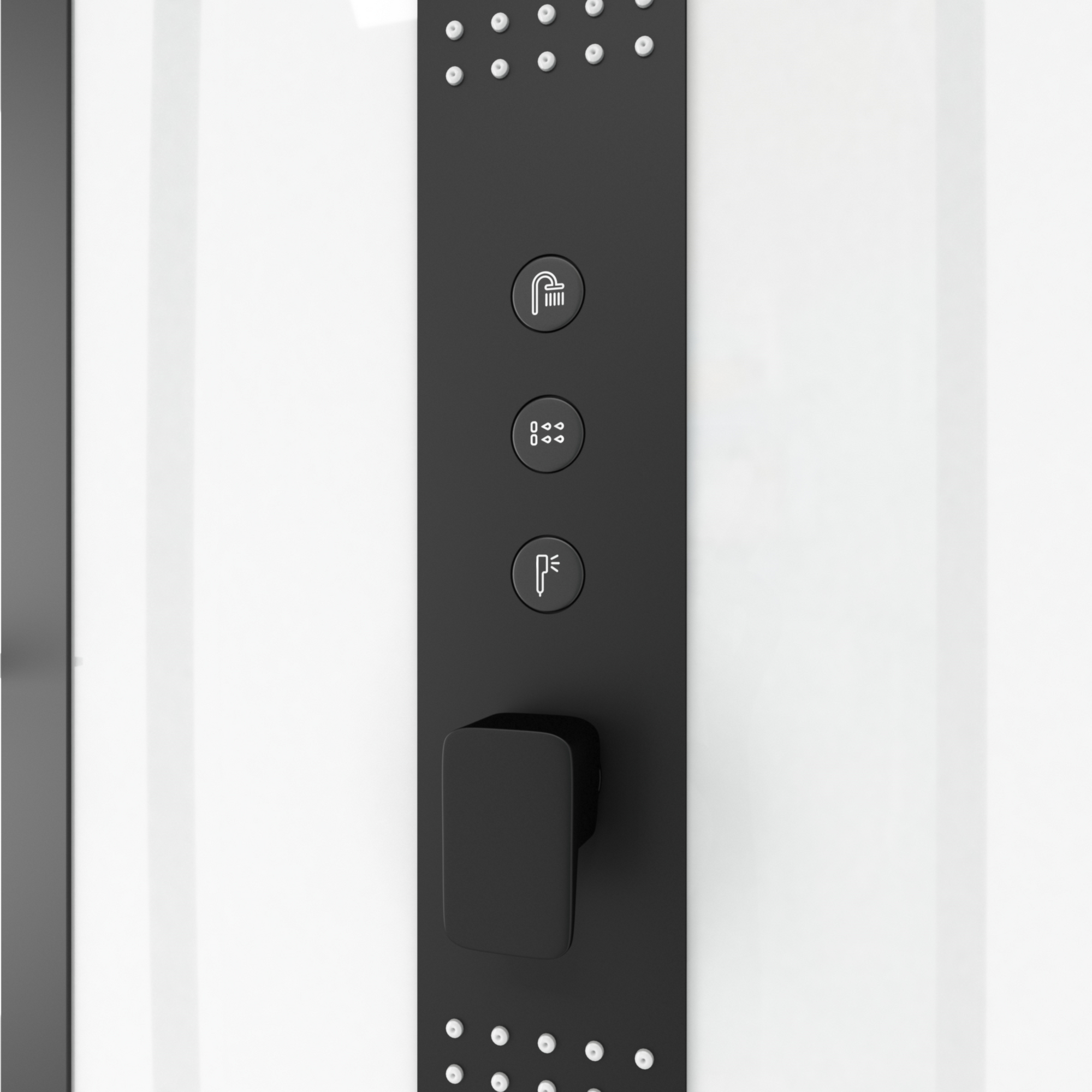 Het bedieningspaneel van roestvrijstaal heeft een mechanische mixer en een antikalk handdouche met een mat zwarte PVC doucheslang. En dankzij het handige metalen zwarte plankje zijn jouw douchespullen altijd binnen handbereik. Voor de meest ontspannen douche-ervaring maak je gebruik van de 41x28 cm hoofddouche die geïntegreerd is in het dak. De wit versterkte acryl douchebak is voorzien van een 90 mm hoge afvoer.