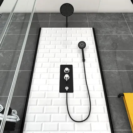 Het bedieningspaneel van roestvrijstaal heeft een mechanische mixer en een antikalk handdouche met een mat zwarte RVS doucheslang. Voor de meest ontspannen douche-ervaring maak je gebruik van de antikalk hoofddouche. De wit versterkte acryl douchebak is voorzien van een 90 mm hoge afvoer. De vereiste hoogte voor installatie bedraagt 235 cm.