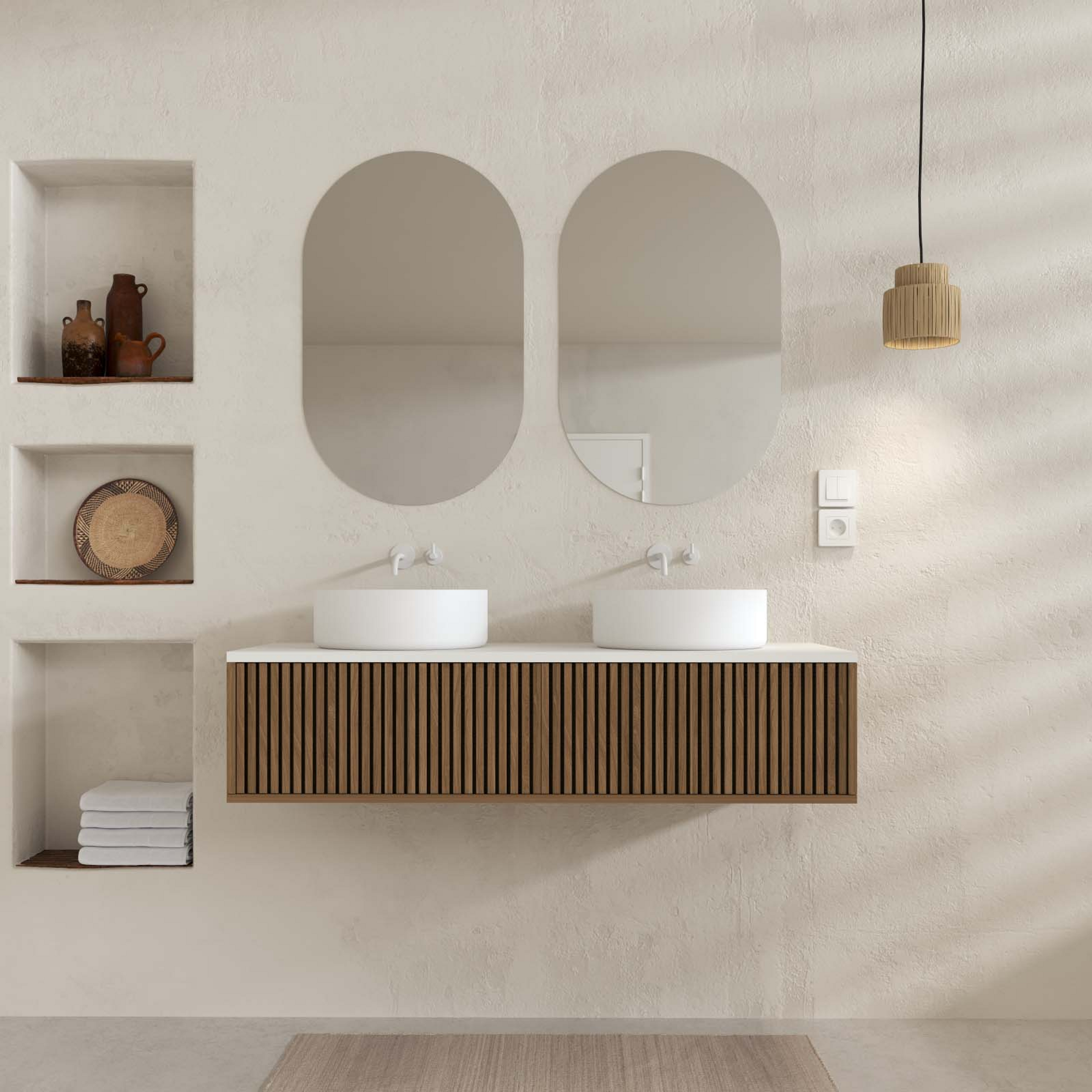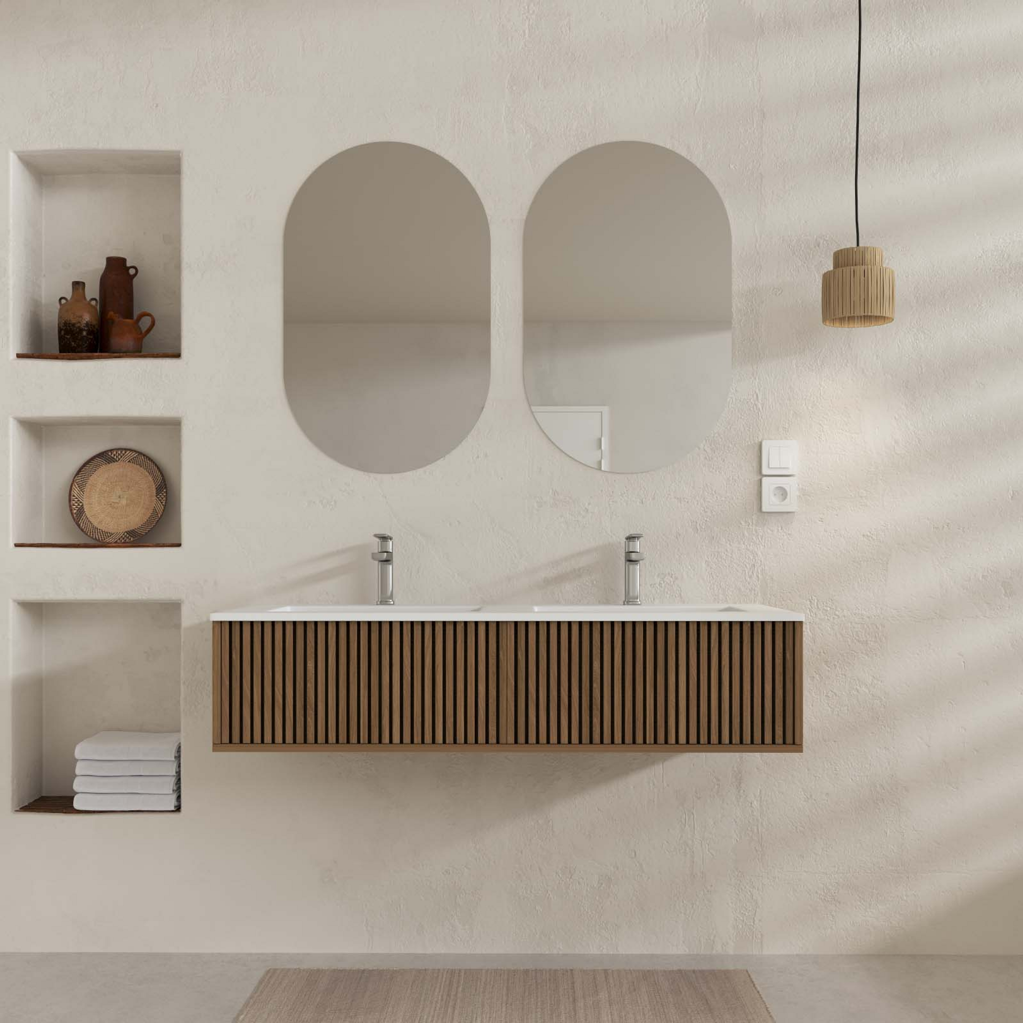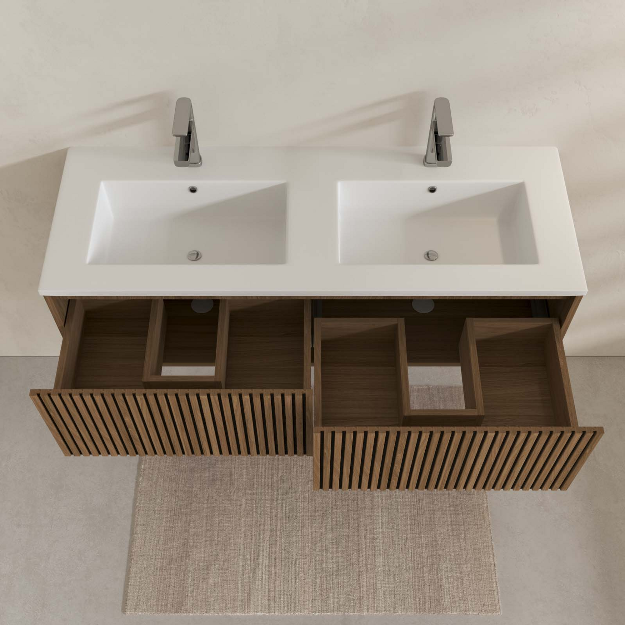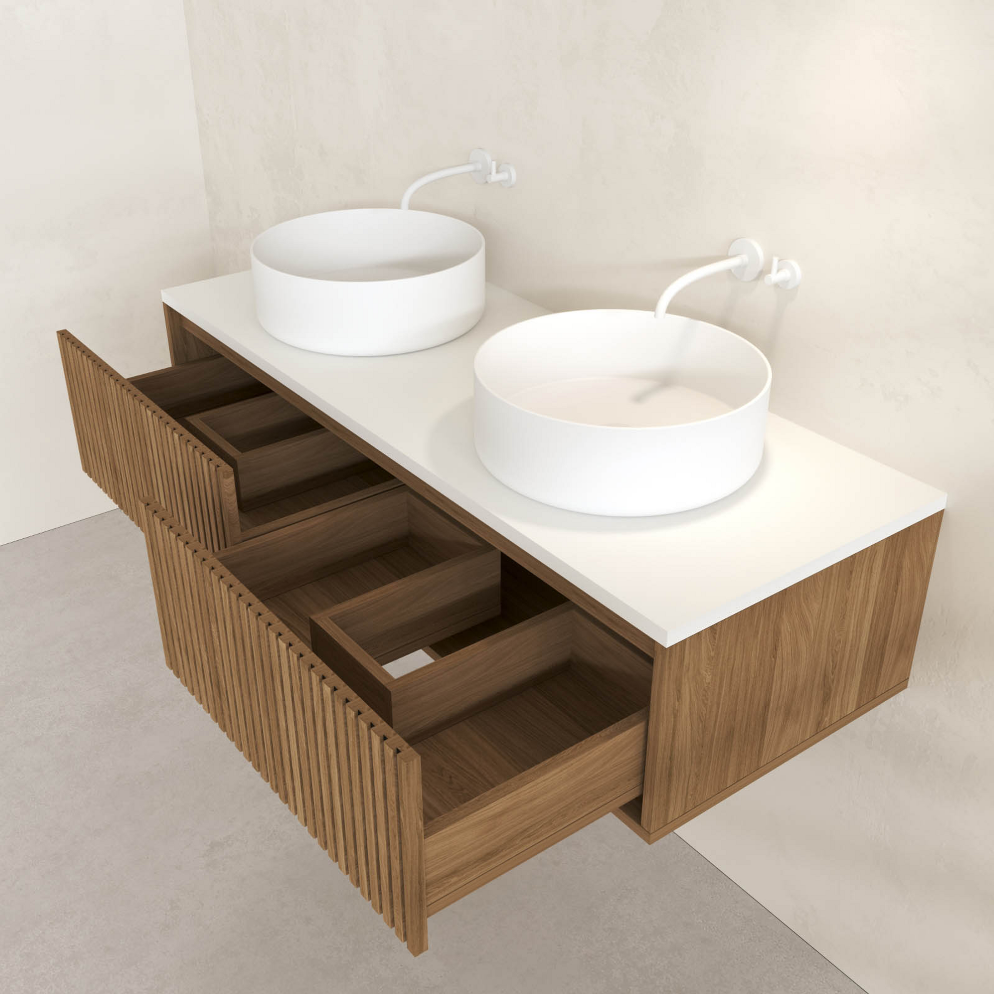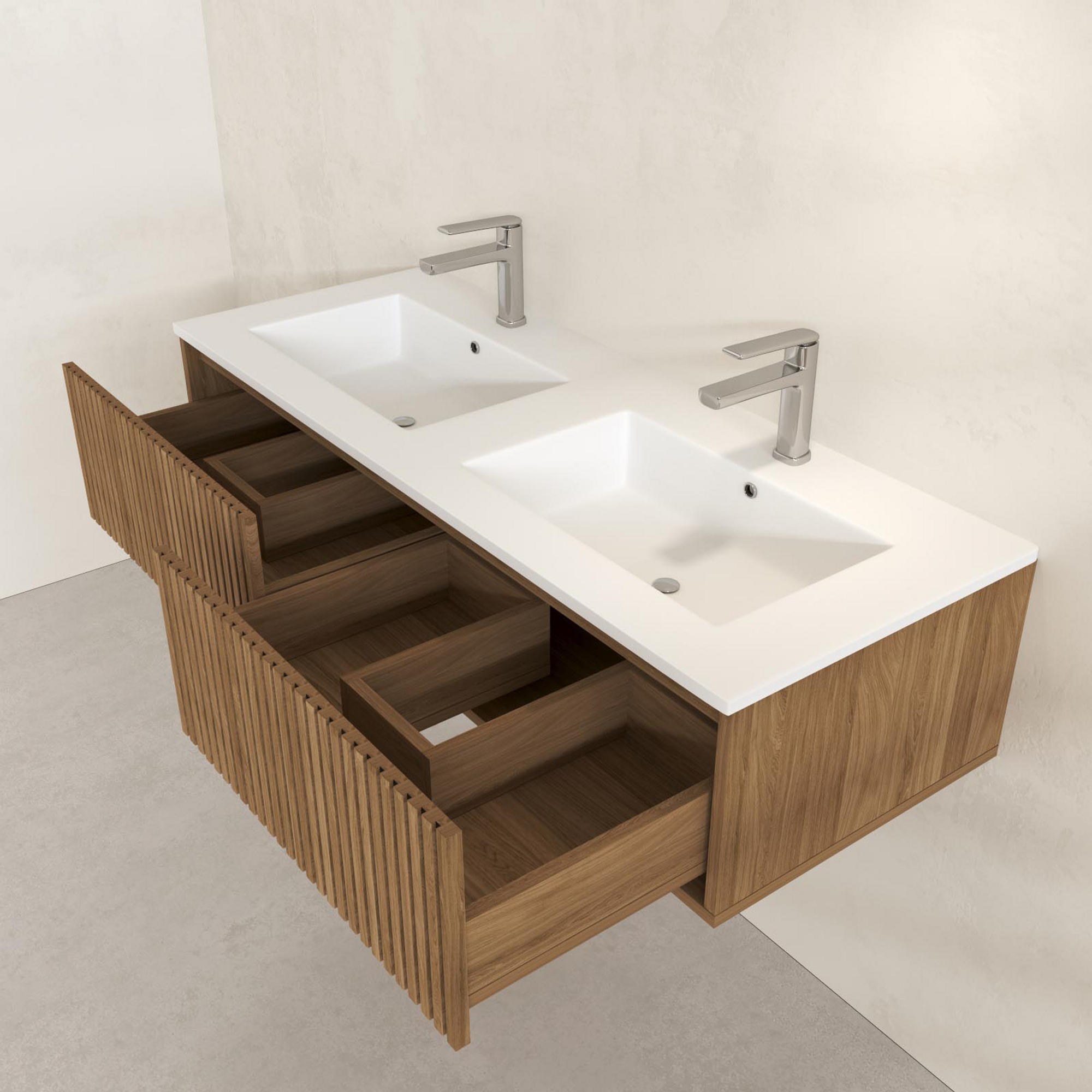 Algemene beschrijvingFUJI 120 is een meubel met een echte Japandi-geest: elegant Japans design gecombineerd met de gezelligheid van Scandinavische stijl. Het geribbelde front in hout en zwart speelt met reliëf en materialen en geeft jouw badkamer een decoratieve, designvolle touch. De greeploze lade opent met een lichte druk dankzij het push-to-open systeem en sluit zacht en geruisloos door soft-close. Zo blijft het lijnenspel strak en oogt je badkamer altijd opgeruimd.
