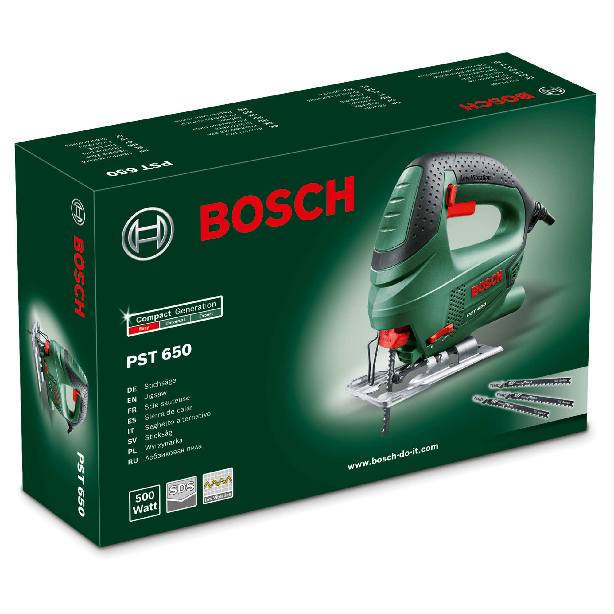 De PST 650 is een compacte decoupeerzaag voor eenvoudige zaagklussen. Het compacte formaat, het geringe gewicht en de uitstekende hanteerbaarheid zorgen voor gecontroleerd en optimaal gebruikerscomfort. De geïntegreerde, individueel inschakelbare blaasluchtfunctie verwijderd zaagspanen snel en betrouwbaar en zorgt voor ononderbroken goed zicht op de zaaglijn. Minimale trillingen door Bosch-Low Vibration, een ergonomische softgrip en een vergrote zaagvoetplaat maakt bovendien de geleiding van de decoupeerzaag gemakkelijker en uitermate precies. De krachtige motor van 500 watt en 65mm zaagdiepte in hout zorgen er daarnaast voor dat met deze decoupeerzaag van Bosch ook zware werkzaamheden erg vlot verlopen. De zaag wordt geleverd inclusief koffer en 1 decoupeerzaagblad voor hout (T 144 D).