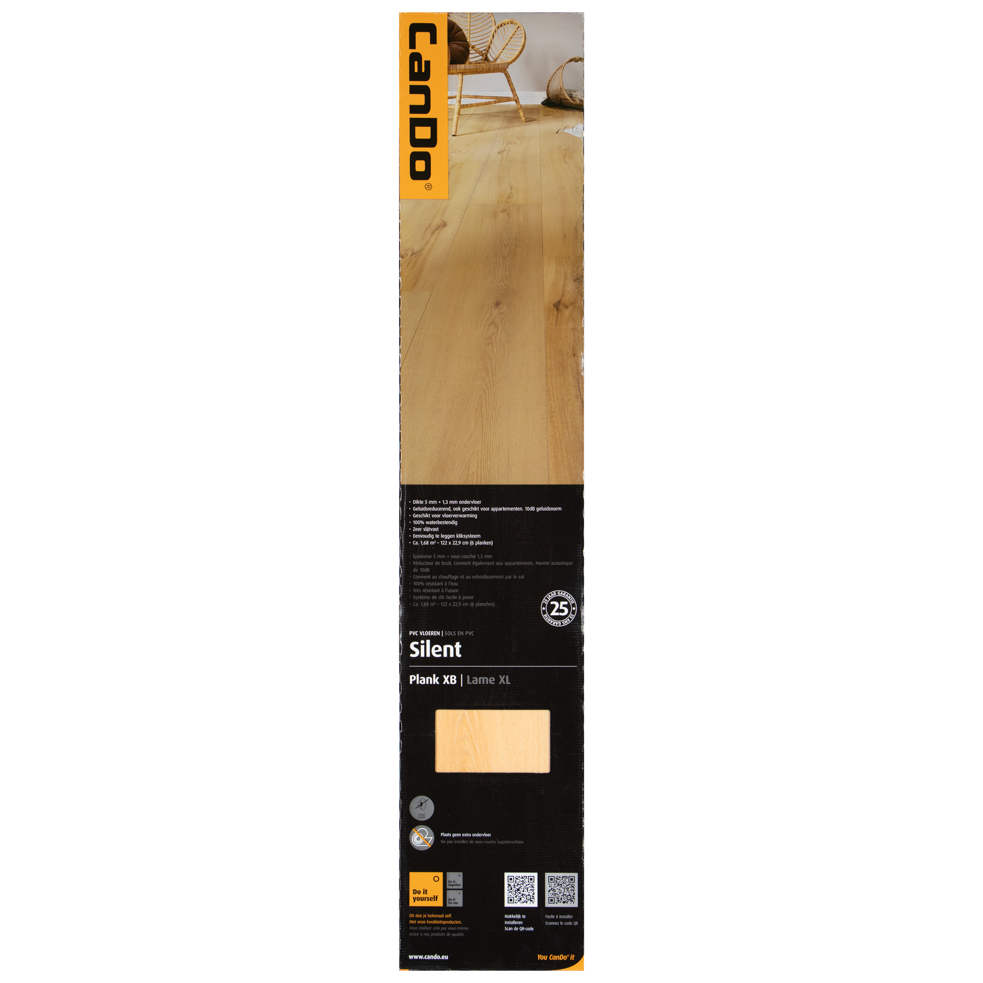 CanDo Silent Rust eiken is een sterk geluidsreducerende PVC vloer met de uitstraling van een echte houten vloer en is zeer geschikt voor appartementen vanwege de geluidsreductie (10dB) . De vloer is 100% waterbestendig, heeft een dikte van 6,3 mm waarvan 1,3 mm de ondervloer betreft. Een losse ondervloer is dus niet nodig. Door het handige clicksysteem is de vloer eenvoudig en snel te leggen. De CanDo Silent vloer is voorzien van een extra sterke slijtlaag. Daarnaast is de vloer zonder problemen te gebruiken in combinatie met (warmwater) vloerverwarming en -koeling. Geproduceerd in Europa.