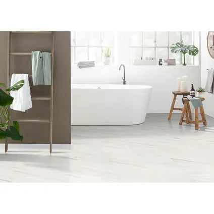 Waterbestendig laminaat Malediven van de Decomode Aqua Kingsize serie is geschikt voor het hele huis en extra makkelijk in onderhoud, omdat je het gewoon kunt dweilen. Het is zelfs te reinigen met een stoomreiniger! Ideaal dus voor gezinnen met kinderen en/of huisdieren. Bovendien is het geschikt voor gebruik in alle vochtige ruimtes, dus ook in de badkamer. Dankzij de vierzijdige V-groef met extra V-groef in het midden, wordt het tegeleffect van het laminaat benadrukt. Decomode Aqua Kingsize laminaat is geschikt voor vloerverwarming en is door middel van een kliksysteem eenvoudig te leggen. De slijtklasse is 32, de dikte van de plank is 8 mm en de breedte 32,7 cm. De Aqua Kingsize laminaatserie is verkrijgbaar in 5 verschillende dessins en heeft bijpassende plinten. Je krijgt 20 jaar garantie op het laminaat.