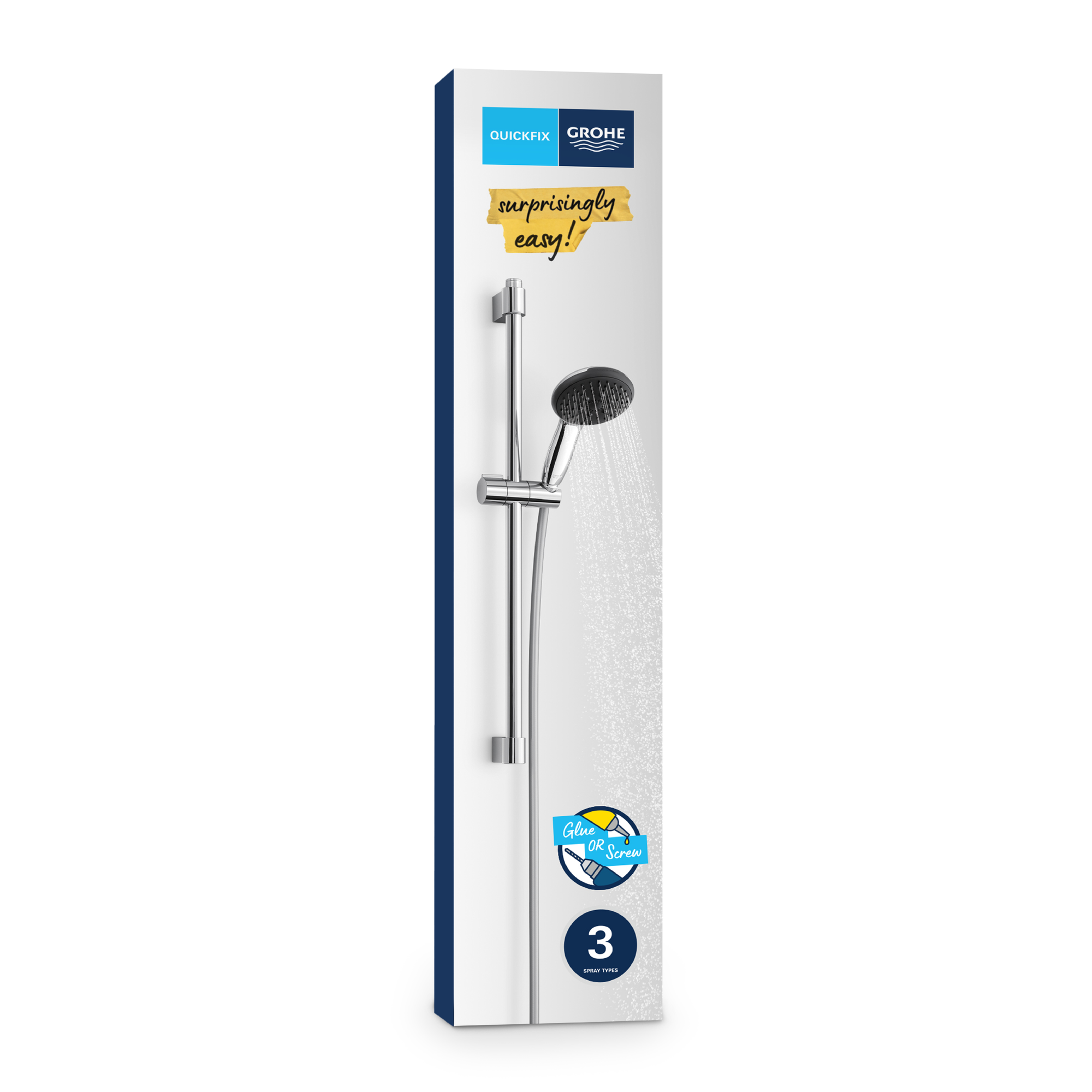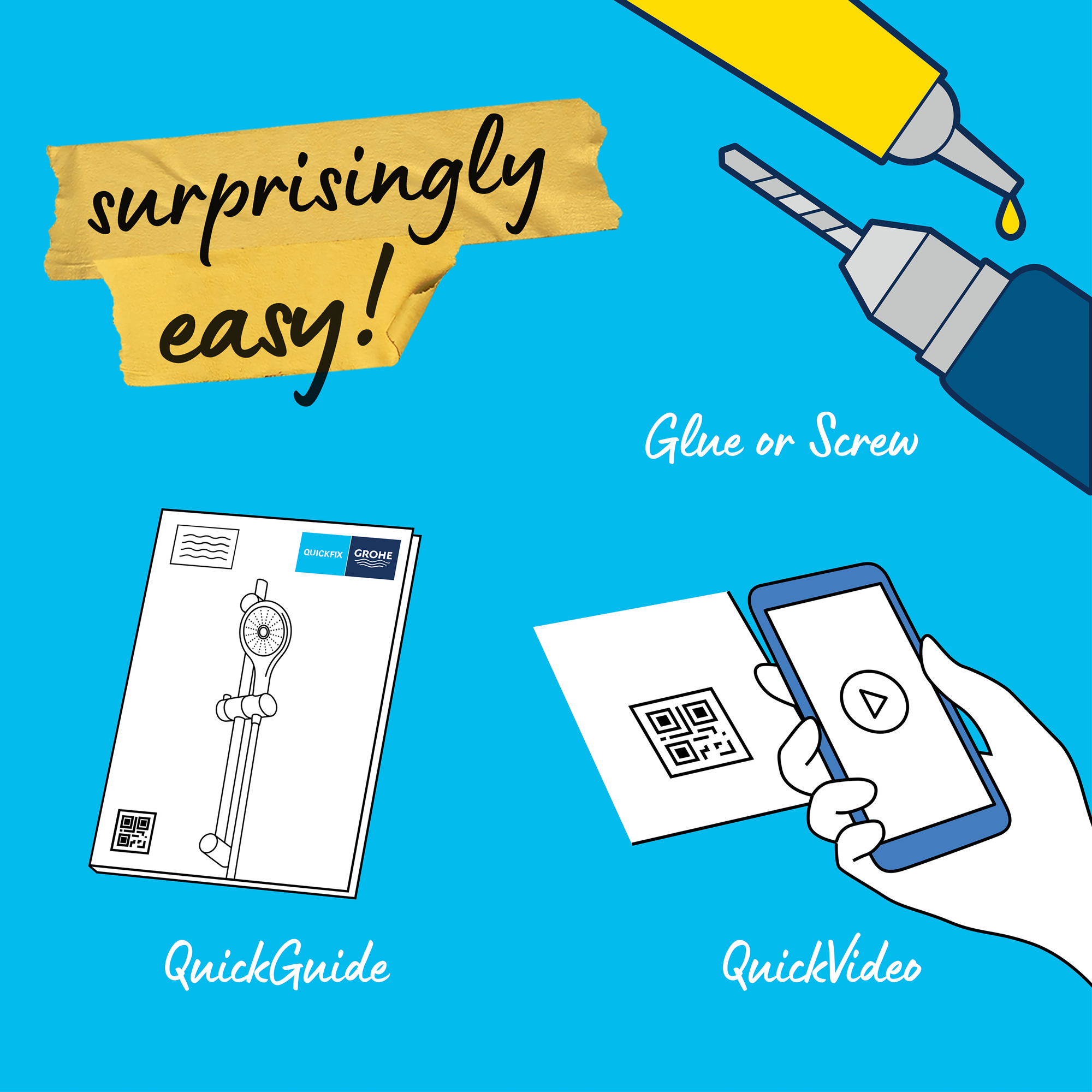 Snelle montage met keuzeBevestig de douchestang met schroeven of gebruik de Grohe QuickGlue S lijmsets (apart verkrijgbaar) voor een montage zonder boren. Dankzij de verstelbare houder past de stang op bestaande gaten.