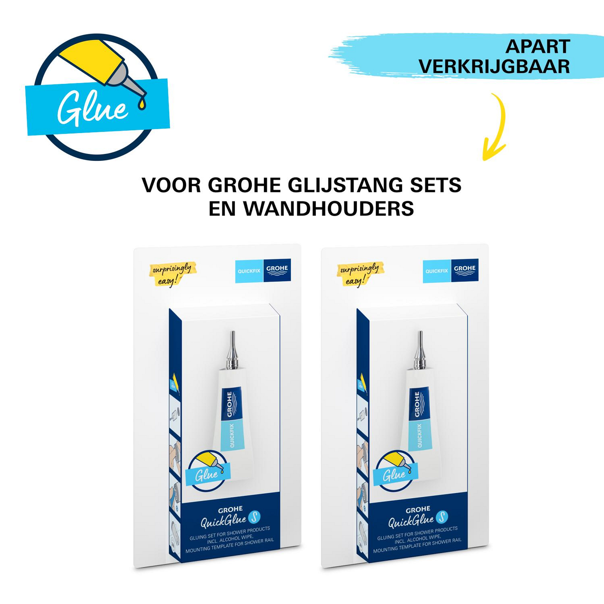 Het monteren van de GROHE Vitalio universele douchestang is snel en eenvoudig. Hier kun je kiezen voor wandmontage met de meegeleverde schroeven en pluggen, of je kunt de douchestang aan de muur plakken. Het enige wat je nodig hebt is de GROHE QuickGlue Set S2 (41245000) die apart verkrijgbaar is. Deze krachtige montagelijm is de oplossing als je niet door muren wilt boren.