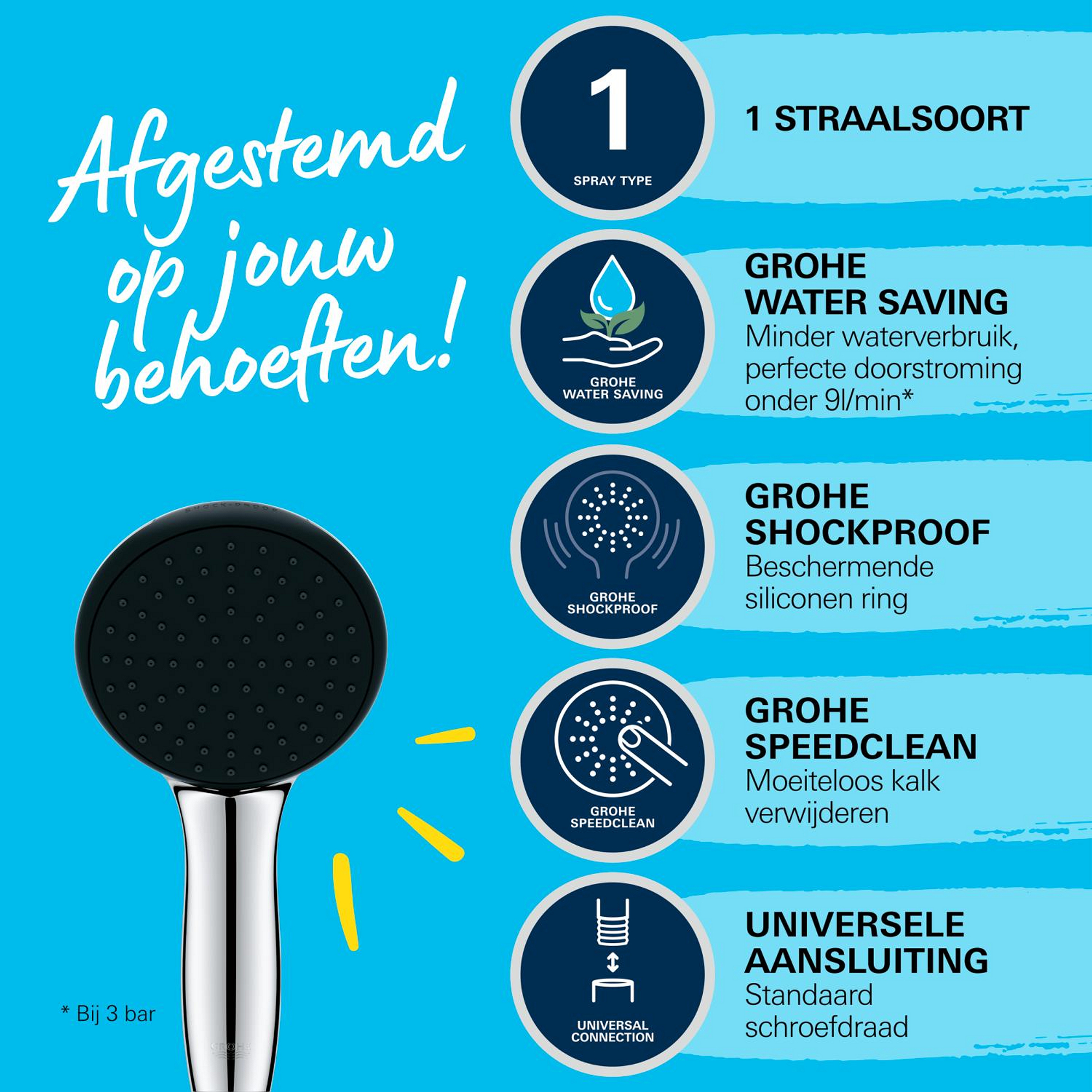 De handdouche schoonmaken is kinderspel. Veeg de gaatjes van de antikalk SpeedClean straal eenvoudigweg schoon met een vingertop en de slijtvaste GROHE Long-Life Shine afwerking zorgt voor een krasvrije chroomglans. Uitgerust met een ShockProof siliconen ring is de handdouche optimaal beschermd tegen beschadiging bij een eventuele val in bad of douchebak.