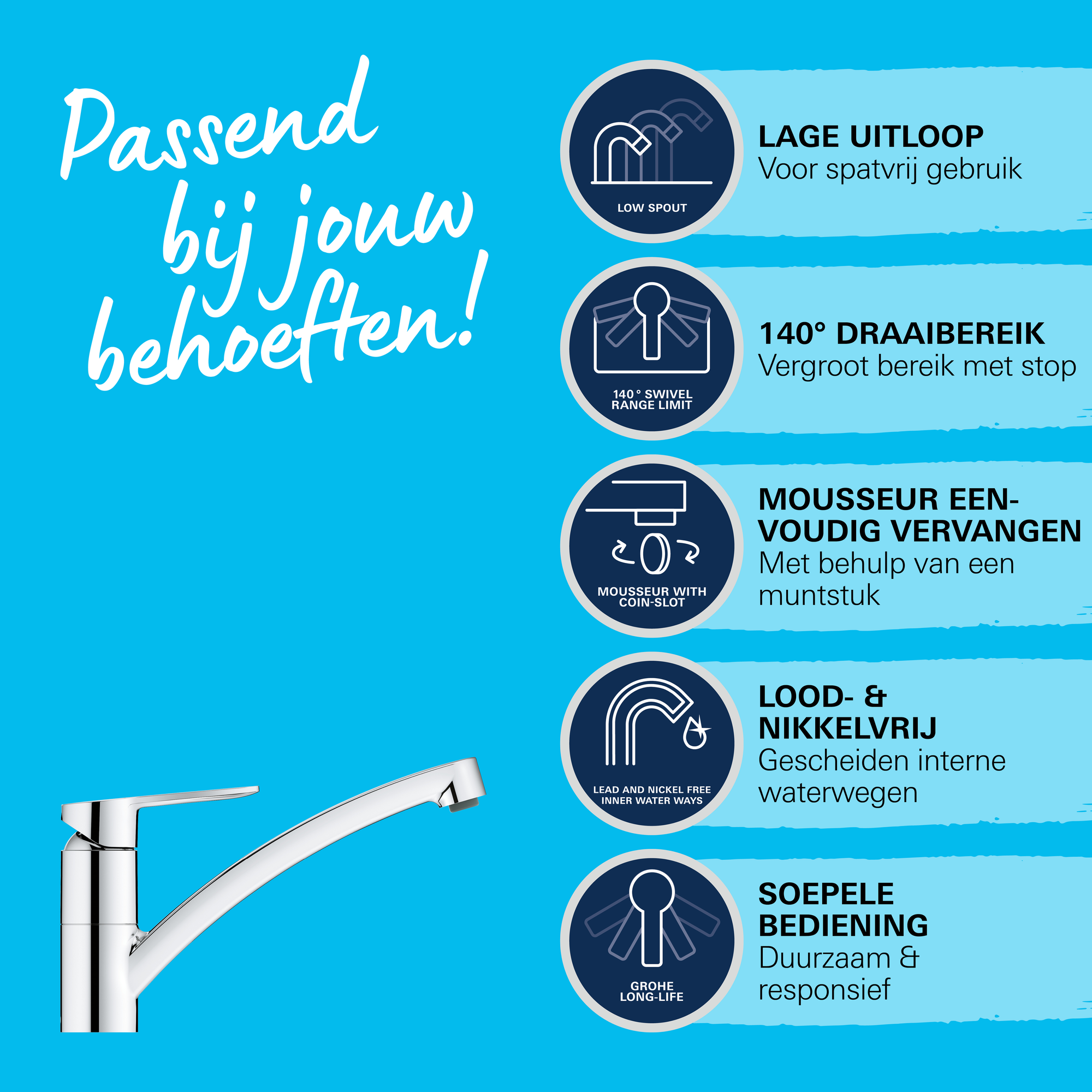 De Grohe Alira Start lage keukenmengkraan is de ideale keuze voor wie compact, stijlvol én efficiënt wil werken. Tip: combineer met een compacte spoelbak voor een slimme keukenoplossing. Ga voor comfort én ruimtebesparing.