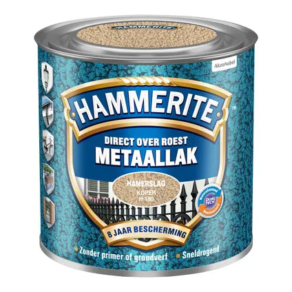 Hammerite Metaallak Hamerslag is een decoratieve roestwerende metaallak voor alle soorten ferro metalen, zowel nieuw als roestig en beschadigd. Deze metaallak kan direct over roest aangebracht worden, er is dus geen grondverf meer nodig. Dit product is kras- en stootvast, stopt het roestproces en geeft 8 jaar bescherming tegen roest. Hammerite Metaallak Hamerslag is waterafstotend en weerbestendig waardoor het goed gebruikt kan worden voor de bescherming van allerlei metalen objecten in en om het huis. Dit product heeft een bijzonder hamerslageffect waarmee oneffenheden gemakkelijk worden gemaskeerd.
