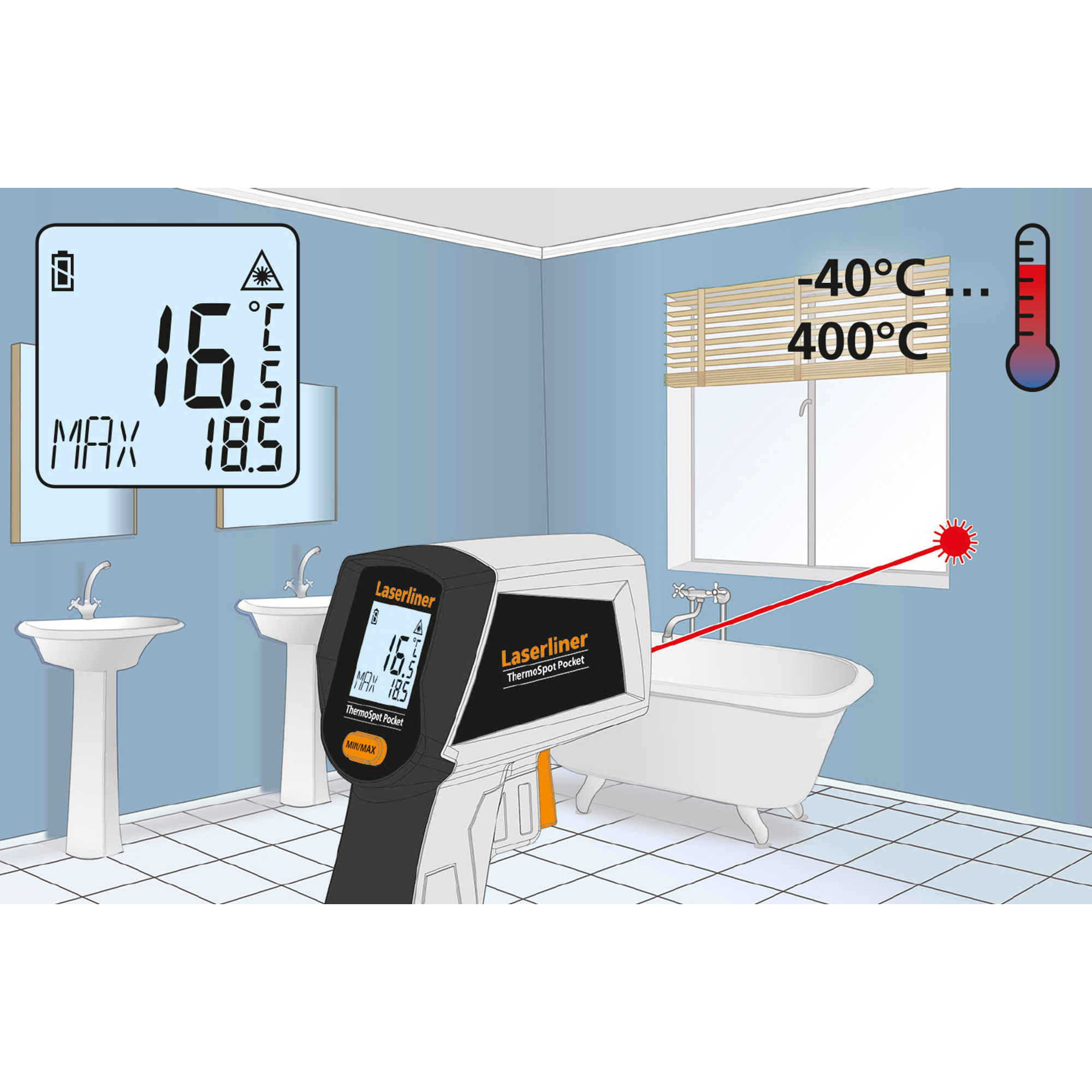 De contactloze infraroodthermometer Laserliner ThermoSpot Pocket is ideaal voor het nauwkeurig meten van oppervlaktetemperaturen, zelfs op moeilijk bereikbare plaatsen. De richtlaser maakt het mogelijk om het meetgebied nauwkeurig te richten.