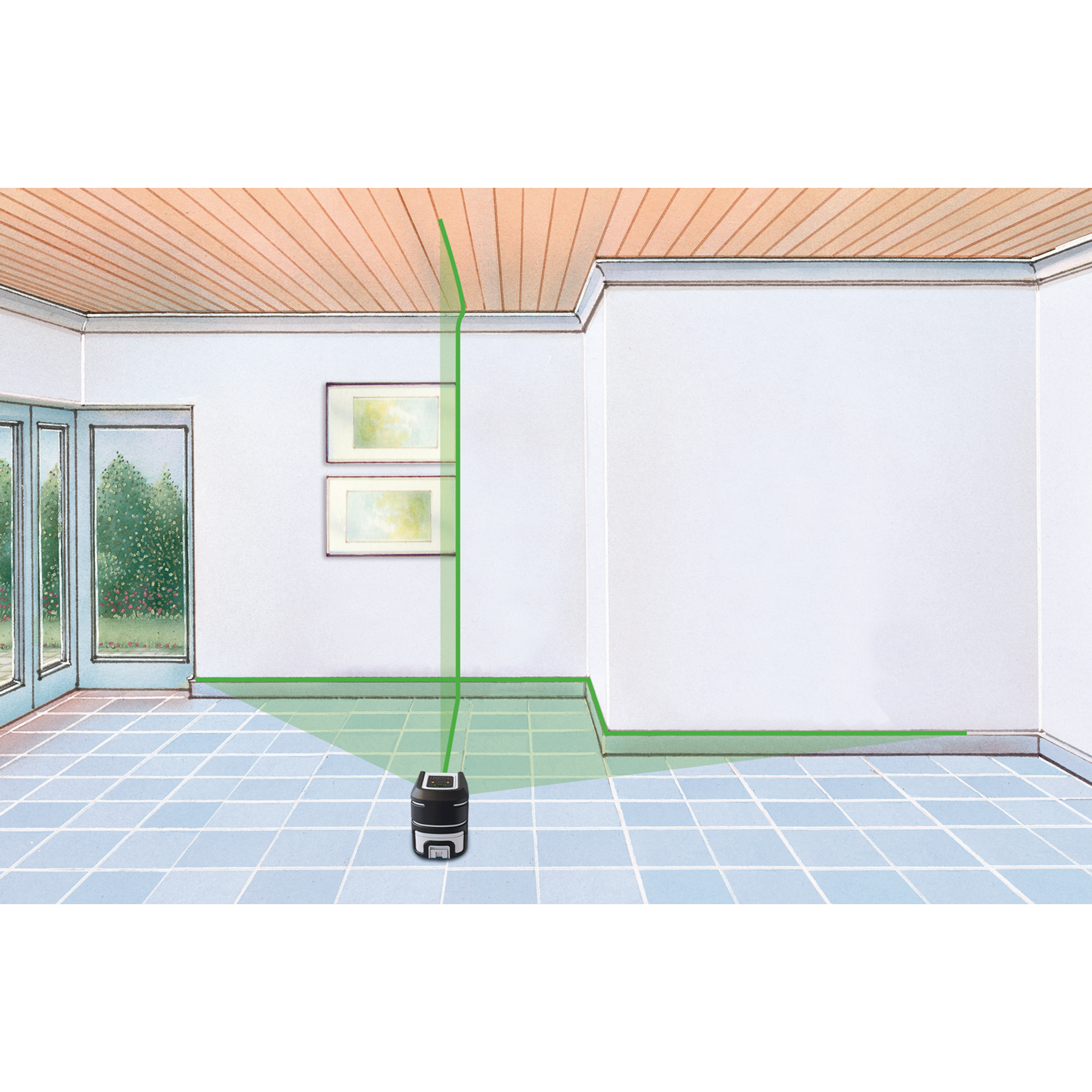 De kruislijnlaser Laserliner GX projecteert een goed zichtbaar groen laserkruis voor nauwkeurige uitlijning van objecten, zowel horizontaal als verticaal. Hij is bovendien uitgerust met een handmatige kantelfunctie, waarmee het apparaat eenvoudig op een helling kan worden ingesteld, en een 1/4-inch schroefdraad voor montage op een statief.