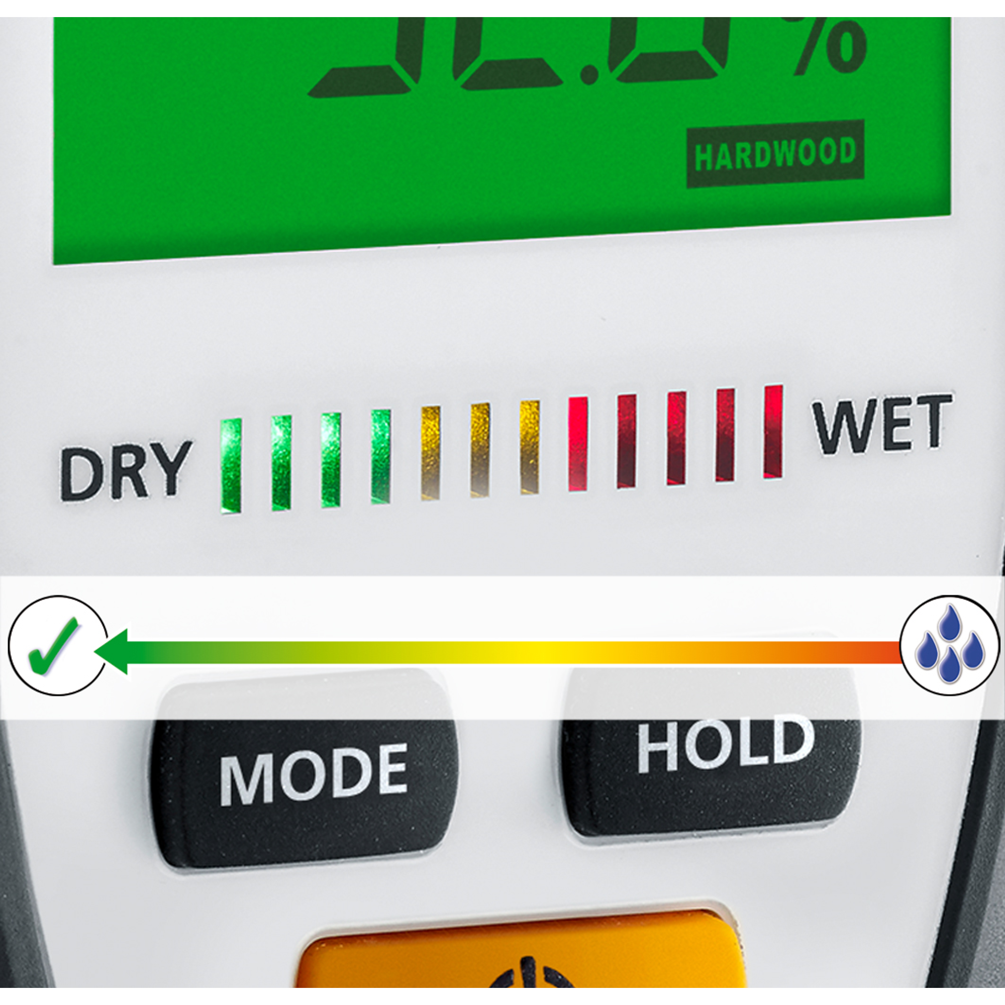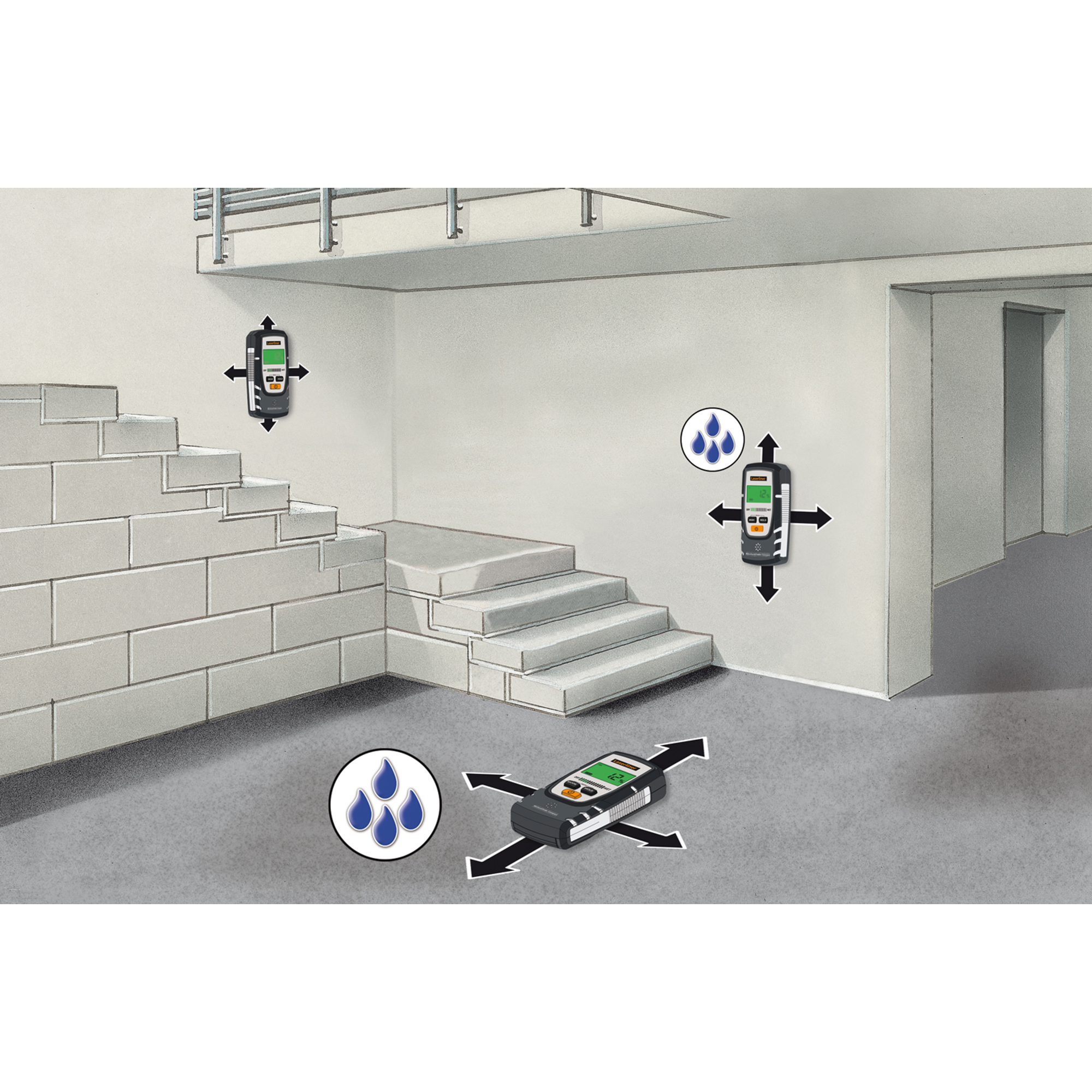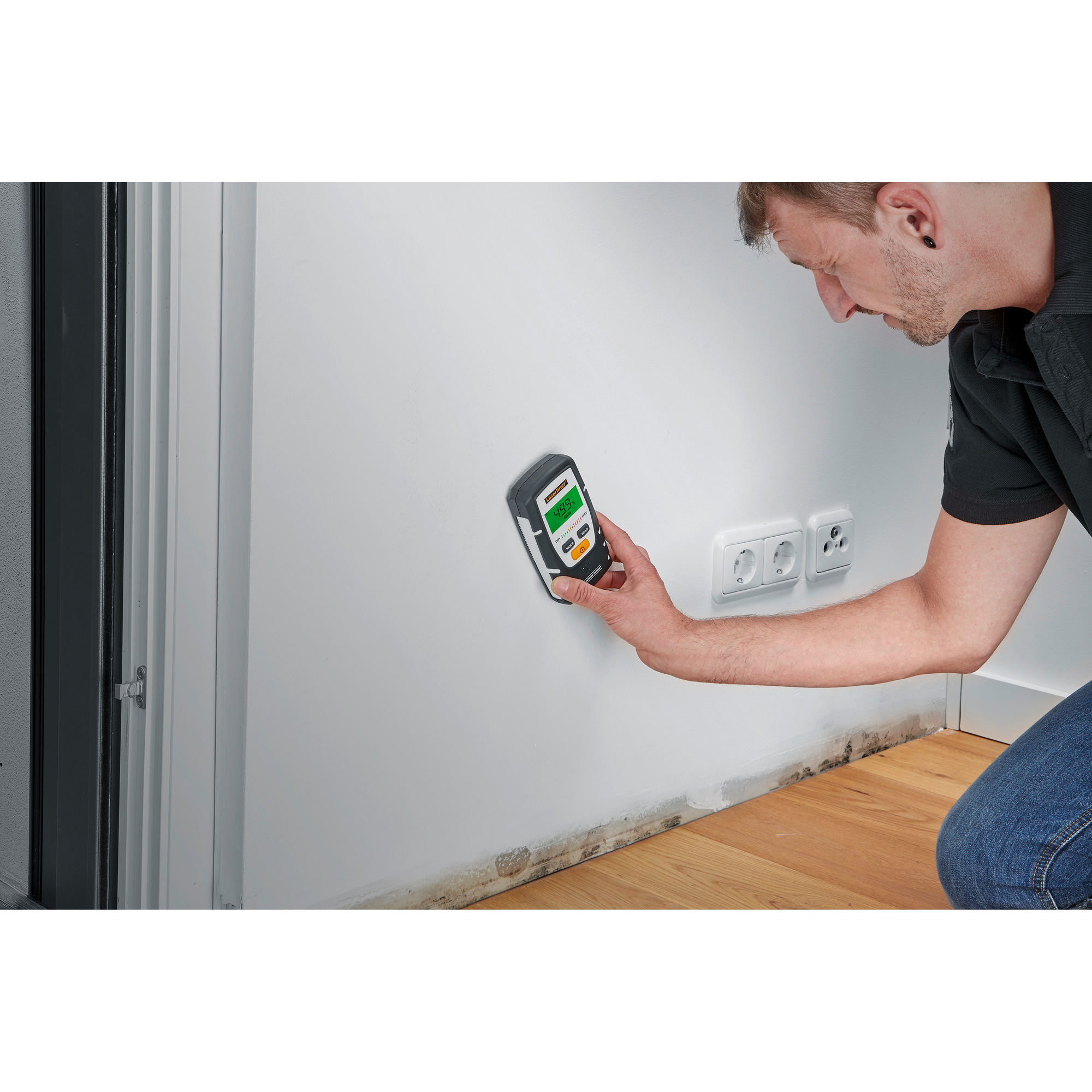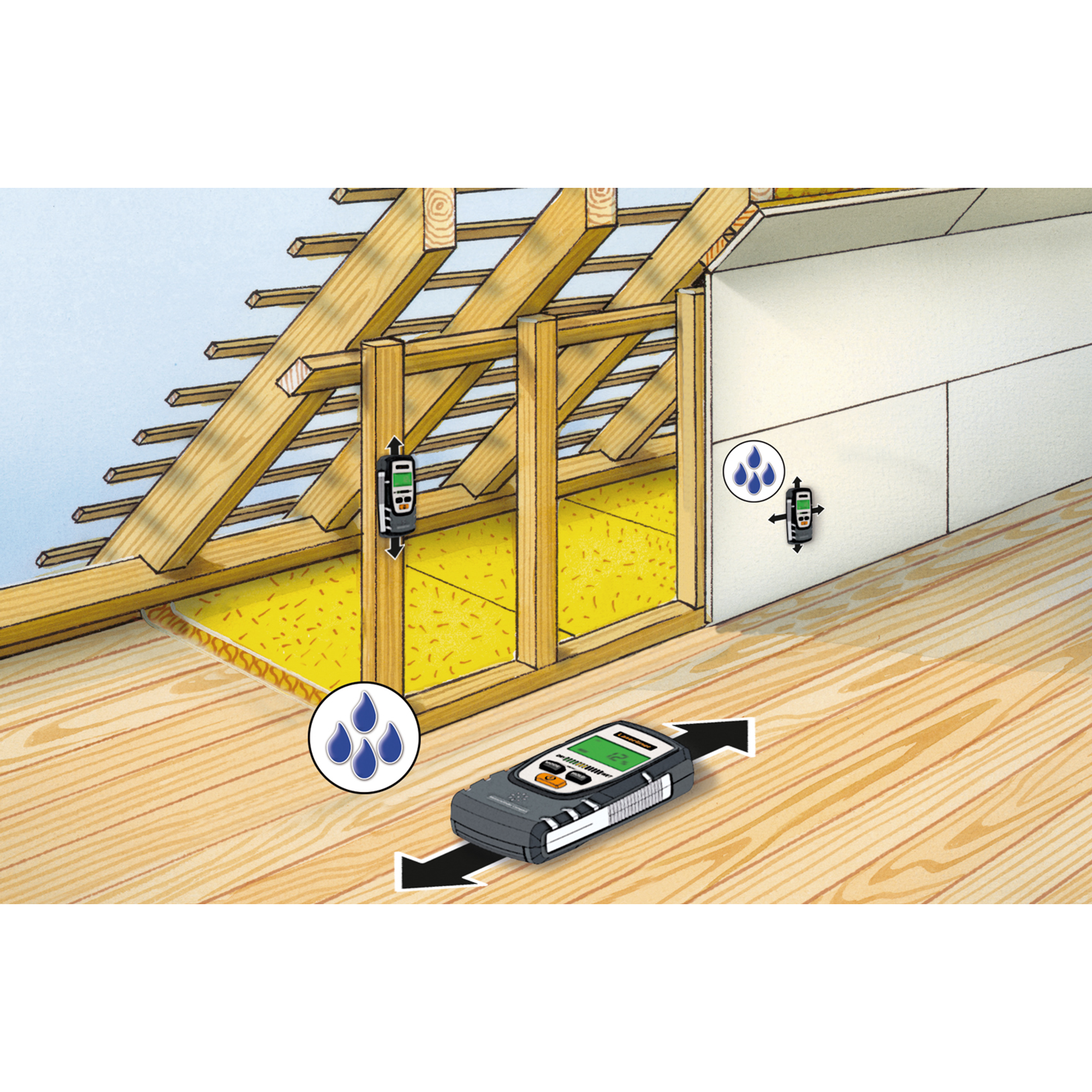 De compacte vochtmeter Laserline MoistureFinder Compact biedt een niet-destructieve meting van vocht in bouwmaterialen en hout. Het apparaat heeft vier selecteerbare materiaalkenmerken voor zacht hout (bijvoorbeeld spar, den), hard hout (bijvoorbeeld beuk, eik), gipspleister en cementdekvloeren. De nat-droog-indicator met twaalf gekleurde LED's geeft direct informatie over de vochtigheid of droogte van het geteste object.