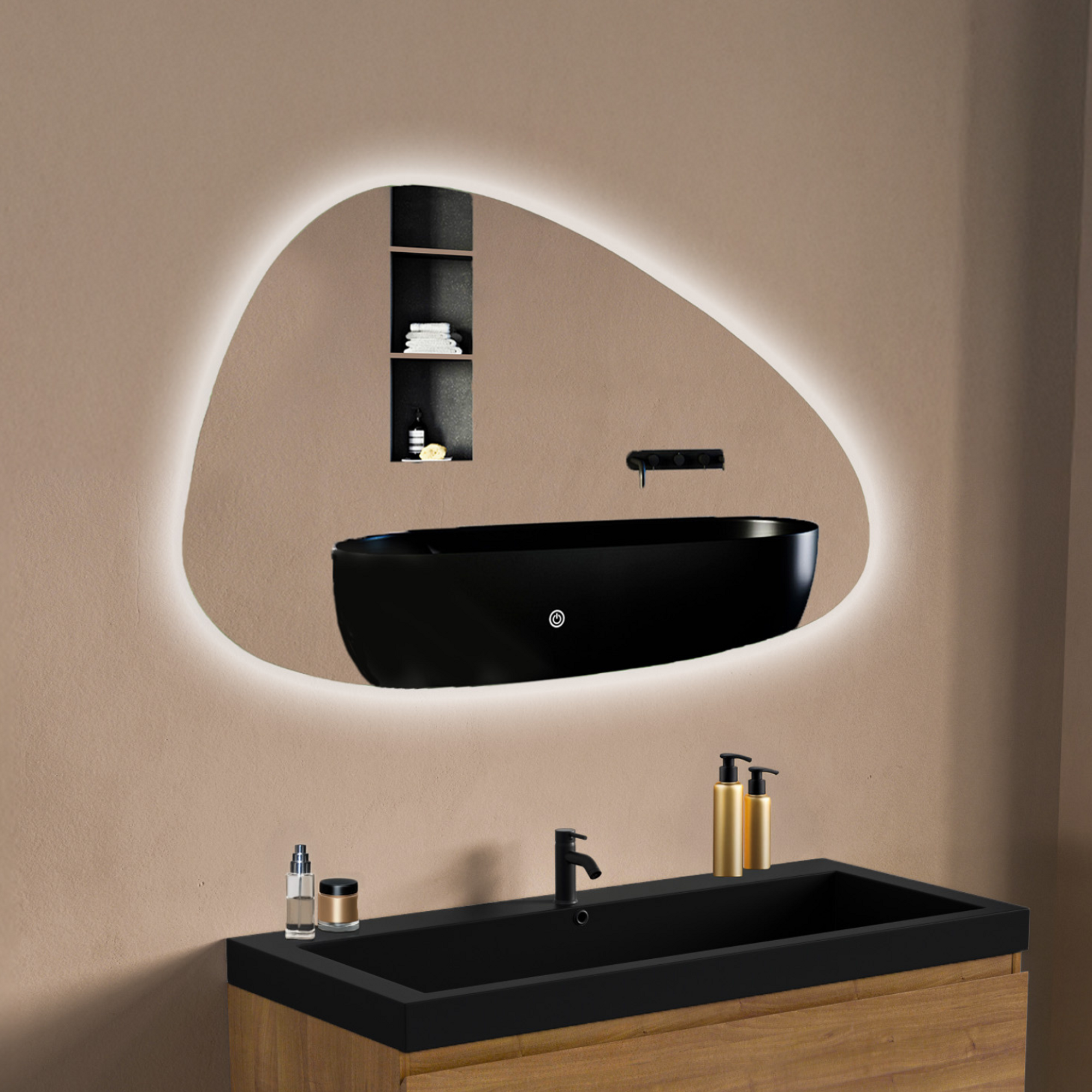 Altijd helder zicht, zelfs na een hete douche. De LOMAZOO Malaga badkamerspiegel combineert een strak design met slimme functies zoals anti-condensverwarming en instelbare LED-verlichting. Dankzij de asymmetrische vorm krijgt je badkamer een moderne en unieke uitstraling.