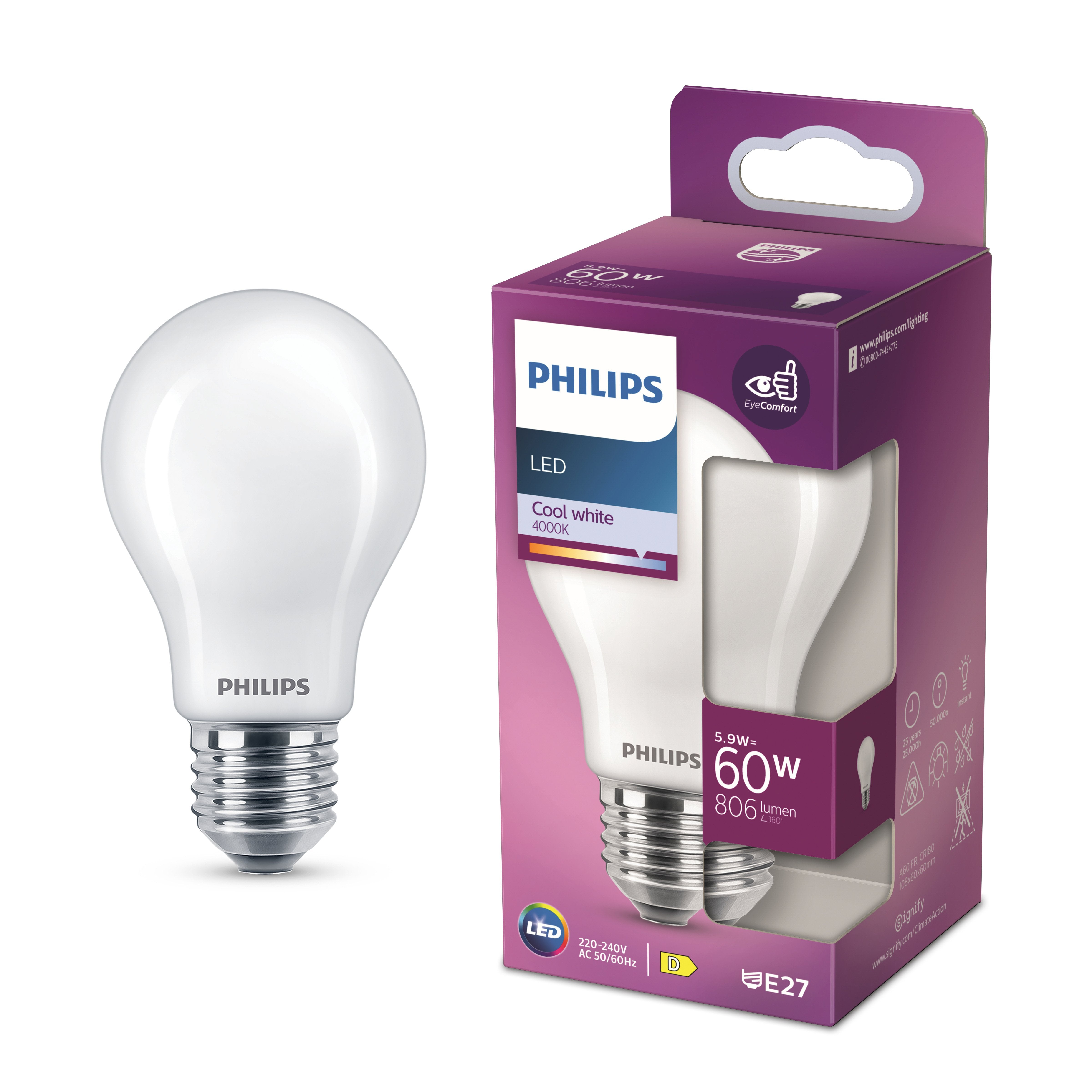 Philips LED lamp - Standaard lampvorm met E27 fitting - Koelwit licht: 4000K - 60W - Mat glas