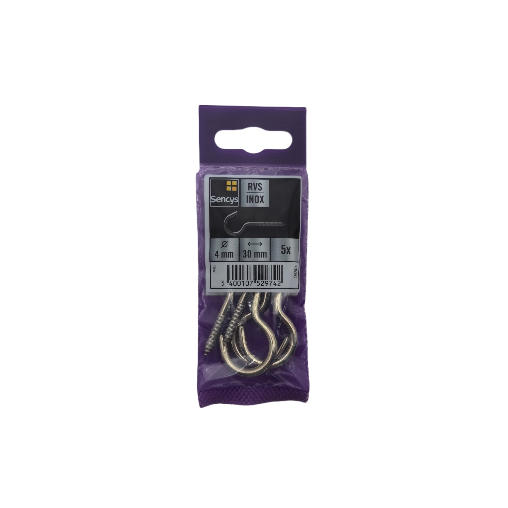 Deze schroefhaak van Sencys is gemaakt van RVS. Ze zijn per 5 stuks verpakt.